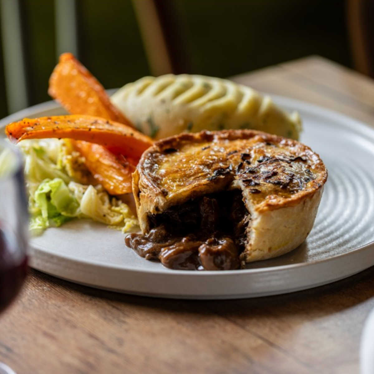 British steak & Butcombe ale pie, mashed potato or skin-on chips, seasonal veg 1011 kcals